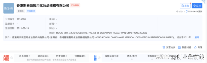 天眼查顯示,香港斯樂薇醫(yī)用化妝品機(jī)構(gòu)有限公司為私人股份有限公司,已宣告解散。對于百植萃品牌自創(chuàng)立以來的股權(quán)沿革情況,「創(chuàng)業(yè)最前線」已向橘宜集團(tuán)發(fā)去采訪函,截至發(fā)稿未獲回復(fù)。