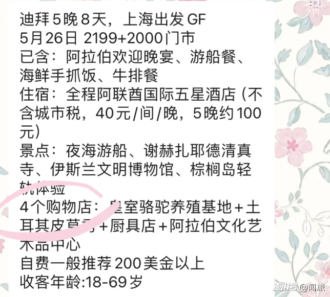 至于為什么便宜?有些旅行社銷售給出解釋稱,便宜是因?yàn)橛小皣?guó)補(bǔ)”,為了提振地方經(jīng)濟(jì)。這真是離譜他媽給離譜開門——離譜到家了。沒想到“國(guó)補(bǔ)”現(xiàn)在都要負(fù)責(zé)提振迪拜經(jīng)濟(jì)了。