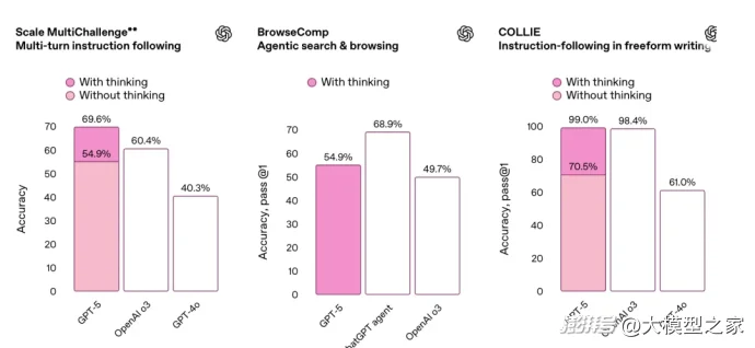 同時(shí),GPT-5在測(cè)試指令遵循和代理工具使用的基準(zhǔn)方面顯示出顯著的增強(qiáng),使其能夠可靠地執(zhí)行多步驟請(qǐng)求,跨不同工具進(jìn)行協(xié)調(diào),并適應(yīng)上下文的變化,處理更復(fù)雜的任務(wù)。