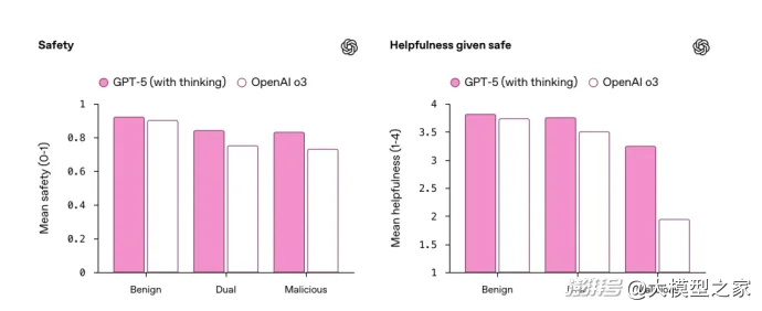 再次,在安全性范式上,GPT-5引入了“安全完成”(safe completions)的訓(xùn)練方法。這與以往主要依賴“拒絕”高風(fēng)險(xiǎn)請(qǐng)求的模式不同,新范式旨在教導(dǎo)模型在遵守安全邊界的前提下,盡可能提供有益的、無(wú)害的回答。例如,在處理具有兩用性的問(wèn)題時(shí),模型可以進(jìn)行高層次的、安全的解答,而不是一概拒絕。