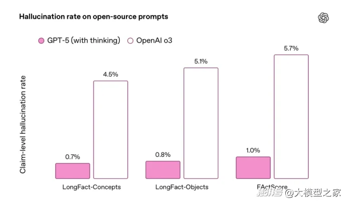 首先,在事實(shí)準(zhǔn)確性方面,GPT-5顯著降低了內(nèi)容“幻覺(jué)”的發(fā)生率。官方數(shù)據(jù)顯示,與GPT-4o相比,GPT-5產(chǎn)生事實(shí)錯(cuò)誤的概率降低了約45%;在啟用深度“思考”模式后,其錯(cuò)誤率相比OpenAI o3更是降低了約80%。在針對(duì)開放式事實(shí)問(wèn)答的LongFact和FActScore基準(zhǔn)測(cè)試中,GPT-5的幻覺(jué)率比o3低了約六倍。