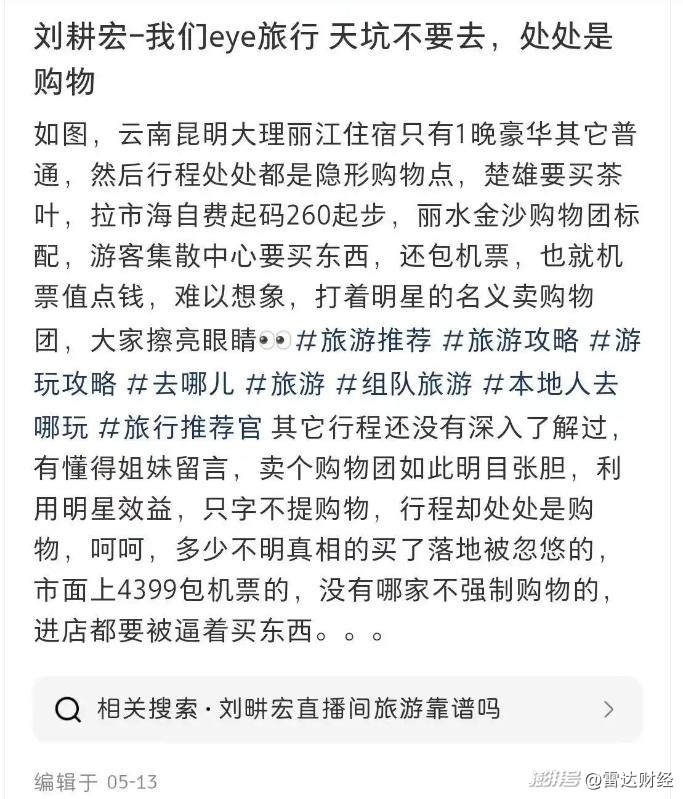 同年5月,一位網(wǎng)友在社交媒體發(fā)文稱(chēng),“劉畊宏-我們eye旅行”推薦的旅行產(chǎn)品強(qiáng)制購(gòu)物。
