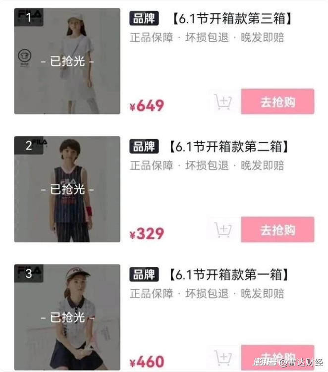 當(dāng)天,直播間一共上架了三款商品,這三款商品均屬斐樂(lè)旗下,定價(jià)分別為329元、460元及649元,上架后很快被搶空。