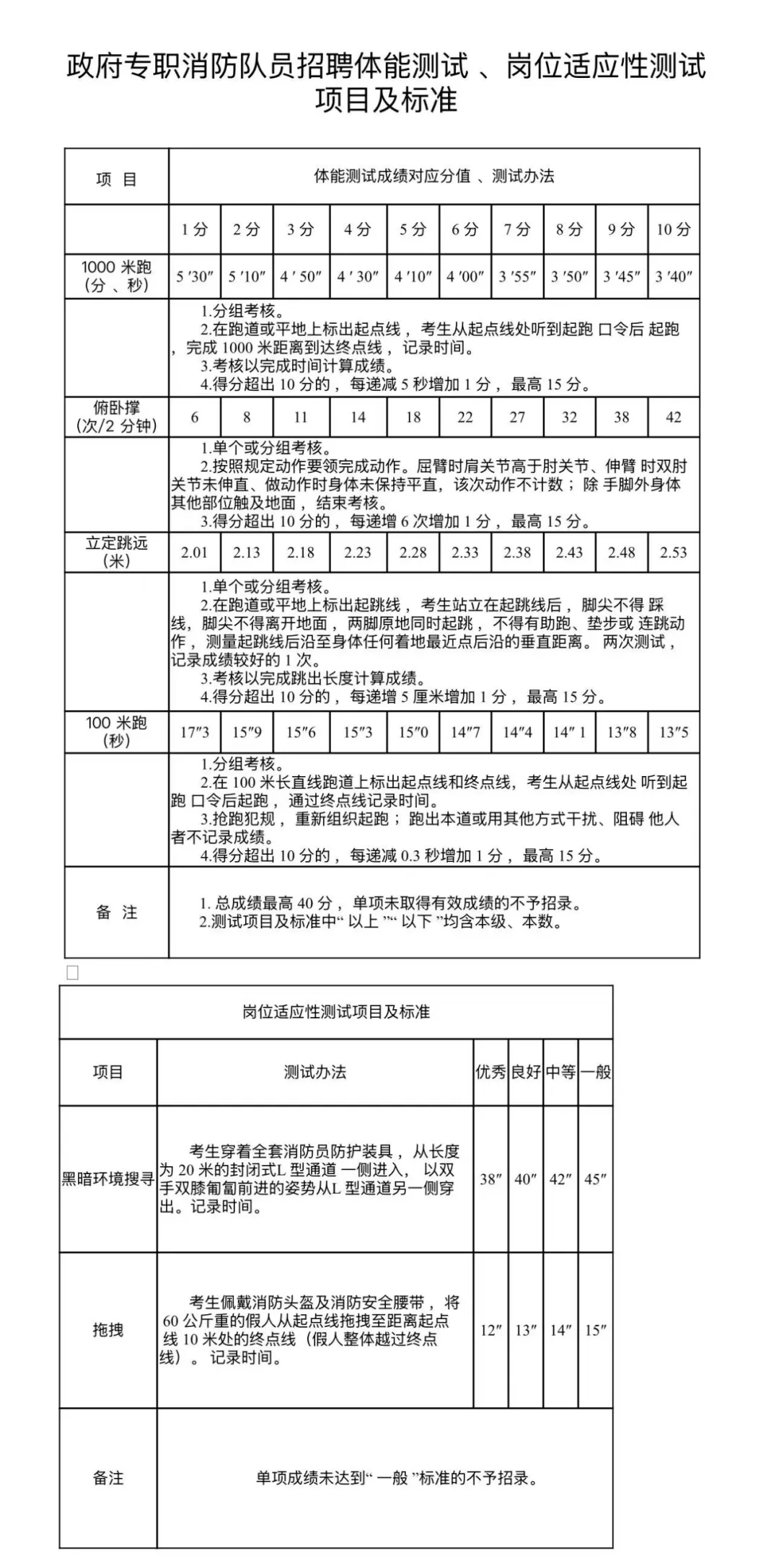 1.森林消防專(zhuān)業(yè)隊(duì)員體能測(cè)試按固定科目進(jìn)行,科目為1000米跑、立定跳遠(yuǎn)、俯臥撐,屆時(shí)填寫(xiě)《體能測(cè)試安全承諾書(shū)》后,按照考試安排參加體能測(cè)試。測(cè)試標(biāo)準(zhǔn)參照2024年《消防員招聘體能測(cè)試、崗位適應(yīng)性測(cè)試項(xiàng)目及標(biāo)準(zhǔn)》(附件一)執(zhí)行,單科項(xiàng)目滿分分別按60分、20分和20分計(jì),不實(shí)施加分,體能測(cè)試任一項(xiàng)目無(wú)分值(即不合格),不合格者不得進(jìn)入下一環(huán)節(jié)。