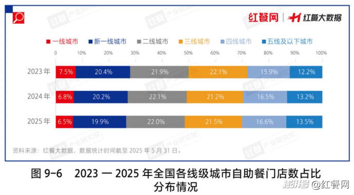 紅餐大數(shù)據(jù)顯示,截至2025年5月,全國三線及以下城市的自助餐門店數(shù)占比為51.6%,比2024年提高了0.7個百分點,比2023年提高了1.4個百分點。