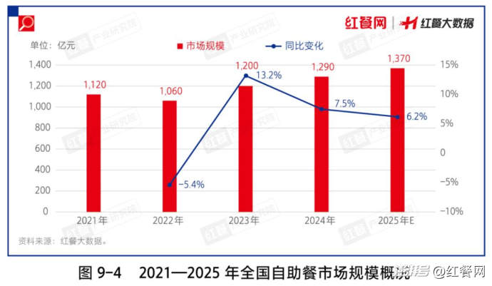近年來,在市場環(huán)境和消費觀念轉(zhuǎn)變的雙重驅(qū)動下,自助餐迎來了新的發(fā)展機遇。不僅自助餐賽道的創(chuàng)業(yè)熱情高漲,眾多非自助餐領(lǐng)域的品牌也紛紛引入了自助模式,進一步拓寬行業(yè)邊界,推動賽道持續(xù)擴容。紅餐大數(shù)據(jù)顯示,2024年自助餐市場規(guī)模為1,290億元,預(yù)計2025年將會突破1,300億元。