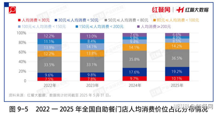 從自助餐的人均消費來看,人均消費在100元以下的“平價自助”門店數(shù)量占比持續(xù)增長。紅餐大數(shù)據(jù)顯示,截至2025年5月,人均消費在100元以下的自助餐門店數(shù)占比為 80%,這一比例較2022年提升了17.2個百分點。