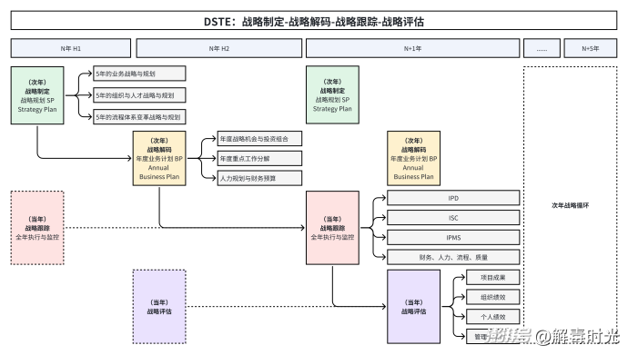 一般來說,通行的DSTE會(huì)以3年或5年為戰(zhàn)略制定所覆蓋的周期,以一年為戰(zhàn)略刷新的周期。在一年的周期中,首先進(jìn)行的是長周期戰(zhàn)略的制定(SP,Strategy Plan),這其中包含了5年的業(yè)務(wù)戰(zhàn)略,以及與之配套的組織人才戰(zhàn)略,同時(shí)還可能包括流程體系變革的相關(guān)戰(zhàn)略;有了這個(gè)戰(zhàn)略之后,就進(jìn)入到戰(zhàn)略解碼階段,會(huì)輸出年度業(yè)務(wù)計(jì)劃(BP,Annual Business Plan),其中包含了年度戰(zhàn)略機(jī)會(huì)與投資,年度重點(diǎn)工作分解,年度的人力規(guī)劃和財(cái)務(wù)規(guī)劃等諸多在一年中可以執(zhí)行甚至完成的事情。
