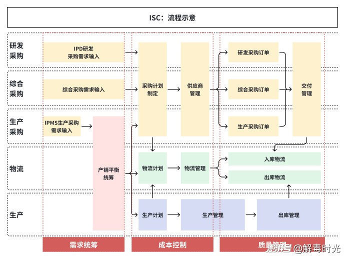 承接IPD當(dāng)中研發(fā)的需求,ISC首要的工作就是基于產(chǎn)品的配置進(jìn)行供應(yīng)鏈的打造。選擇合適的,既能在質(zhì)量上達(dá)到要求,同時(shí)成本又在可控范圍的供應(yīng)商,是ISC的一個(gè)關(guān)鍵指標(biāo)。但I(xiàn)SC不僅面向研發(fā),同時(shí)還要面向產(chǎn)品上市后的生產(chǎn)環(huán)節(jié),要能夠保質(zhì)保量的提供每一個(gè)零部件,這是ISC的又一個(gè)關(guān)鍵指標(biāo)。