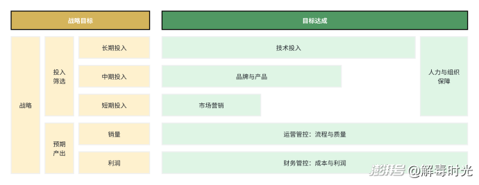 好的戰(zhàn)略還要對(duì)應(yīng)著好的執(zhí)行,對(duì)于汽車企業(yè)來說,長期投入大多屬于技術(shù)類的投入,中期則是品牌和產(chǎn)品,短期就是贏得當(dāng)下成績的市場(chǎng)營銷,當(dāng)然與這三類投入配合的還有人力與組織的保障與建設(shè)。在產(chǎn)出的層面,需要用運(yùn)營的管控來保證銷量,同時(shí)還需要用財(cái)務(wù)管理來平衡成本與利潤。