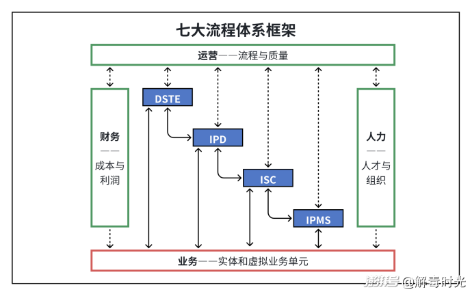 基于DSTE的循環(huán)滾動(dòng),理想的七大一級(jí)流程才能夠有一個(gè)動(dòng)力的源頭,由此構(gòu)成了DSTE推動(dòng)三個(gè)核心業(yè)務(wù)流程IPD、ISC、IPMS以及三個(gè)支撐性的財(cái)務(wù)(關(guān)于成本與利潤)、人力(關(guān)于人才與組織)和運(yùn)營(關(guān)于流程與質(zhì)量)的運(yùn)轉(zhuǎn),將執(zhí)行具體業(yè)務(wù)的實(shí)體單元和虛擬單元帶入后,企業(yè)的總體運(yùn)轉(zhuǎn)進(jìn)入到一個(gè)穩(wěn)定的循環(huán)當(dāng)中。