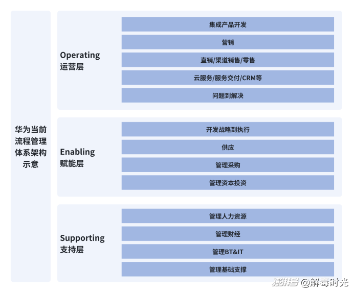 關(guān)于賦能層和支持層就不再展開,大多涉及到回答一個(gè)問題——如果想要好的完成運(yùn)營層的業(yè)務(wù),應(yīng)該有哪些配合的流程,包括戰(zhàn)略、供應(yīng)、采購、資本、人力、財(cái)經(jīng)、IT、流程變革等等。這就是華為流程建設(shè)和應(yīng)用的基本思路和大概框架。