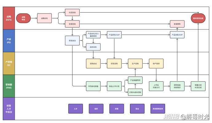 在卷到無以復(fù)加的21世紀(jì)中國汽車市場(chǎng),擁抱IPD似乎成了那個(gè)萬能的解藥。在這個(gè)高舉“流程大旗”的浪潮里,理想汽車是較早且較為徹底的尋求IPD的幫助的,2021-2022年之間就開始導(dǎo)入IPD。到了2024年,已經(jīng)形成了7個(gè)一級(jí)流程,對(duì)應(yīng)下分別是:DSTE(Develop Strategy to Execute,從戰(zhàn)略開發(fā)到執(zhí)行)、IPD(Integrated Product Development,集成產(chǎn)品開發(fā))、IPMS(Integrated Product Marketing & Sales,集成產(chǎn)品營銷和銷售)、ISC(Integrated Supply Chain,集成供應(yīng)鏈)以及關(guān)于流程IT、人才和財(cái)經(jīng)的三個(gè)流程:BT&IT、LTD、IFS(集成財(cái)經(jīng)轉(zhuǎn)型)。