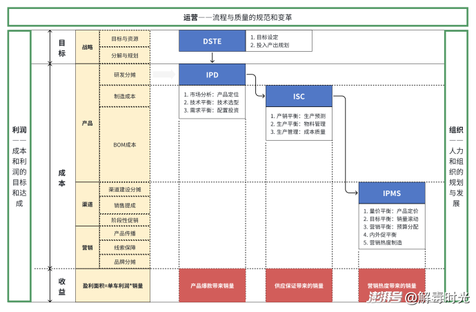 當(dāng)完成這些之后,整體的收益就來自于單車的利潤與銷量的共同貢獻(xiàn)。困擾很多企業(yè)的問題是——銷量從何而來?其實(shí)從這幾個(gè)關(guān)鍵流程來看,每個(gè)流程都會(huì)給銷量帶來貢獻(xiàn)。比如IPD洞察用戶需求將產(chǎn)品打造成爆款可以帶來銷量,ISC供應(yīng)及時(shí)且質(zhì)量可靠也能夠帶來銷量,營銷制造出熱度更能夠?yàn)殇N量助力。企業(yè)真實(shí)的運(yùn)作并非流程架構(gòu)這樣的簡單,但在此也僅僅是將關(guān)鍵內(nèi)容抽象出來,以方便更好的理解。