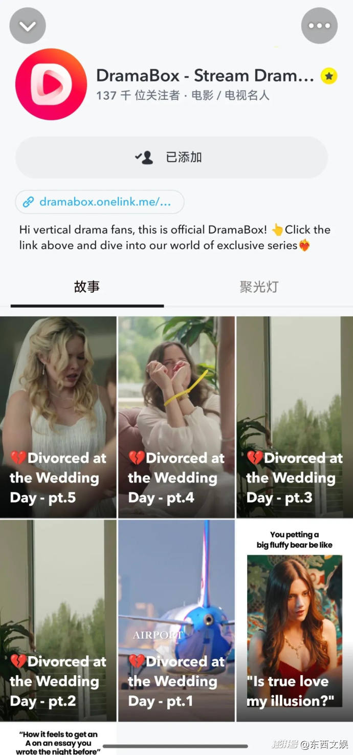 來自客戶的投放反饋也證明了長視頻廣告的成功,比如短劇出海頭部玩家 DramaBox 在投放時使用了長視頻廣告的形式收獲了不錯的投放效果,在Snapchat 上開設的品牌主頁(Public Profile)目前已積累了近 14 萬粉絲。