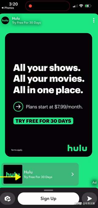 對以 APP 下載為投放目標的用戶來說,Snapchat 首創(chuàng)的全豎屏的內(nèi)容形態(tài),更容易抓取用戶的注意力, 結合底部投放的 APP 露出,能夠對用戶帶來強力的行動呼吁 (call to action)。