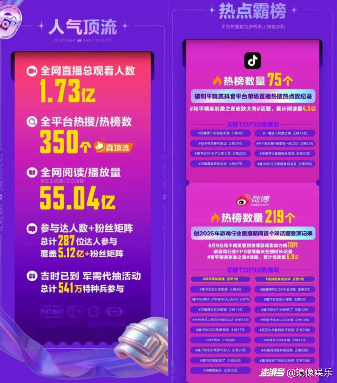 8月13日官方發(fā)布“刺激戰(zhàn)報(bào)”——“刺激之夜”全網(wǎng)直播總觀看人數(shù)1.73億、全平臺(tái)熱搜與熱榜數(shù)350個(gè)、全網(wǎng)閱讀及播放量55億的數(shù)據(jù)成績(jī),已經(jīng)直觀向外界說(shuō)明了,何為一代玩家有一代玩家的“新春晚”。