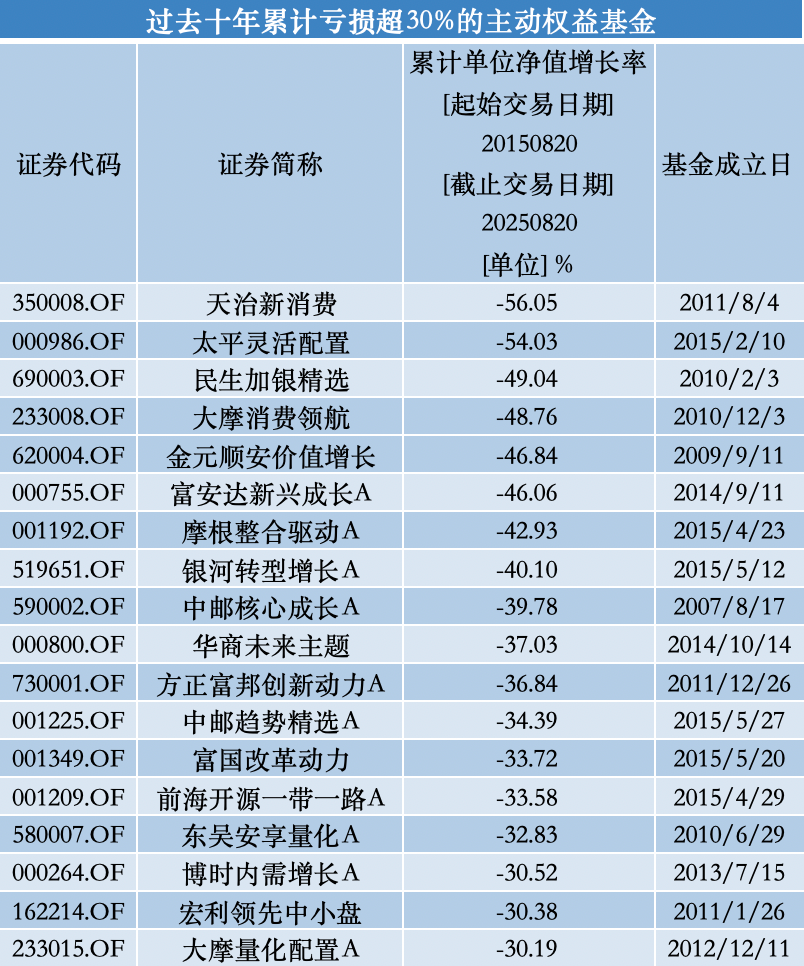 另有10只主動(dòng)權(quán)益基金過去十年累計(jì)虧損率在30%以上,分別為中郵核心成長(zhǎng)A(-39.78%)、華商未來主題(-37.03%)、方正富邦創(chuàng)新動(dòng)力A(-36.84%)、中郵趨勢(shì)精選A(-34.39%)、富國(guó)改革動(dòng)力(-33.72%)、前海開源一帶一路A(-33.58%)、東吳安享量化A(-32.83%)、博時(shí)內(nèi)需成長(zhǎng)A(-30.52%)、宏利領(lǐng)先中小盤(-30.38%)、大摩量化配置A(-30.19%)。