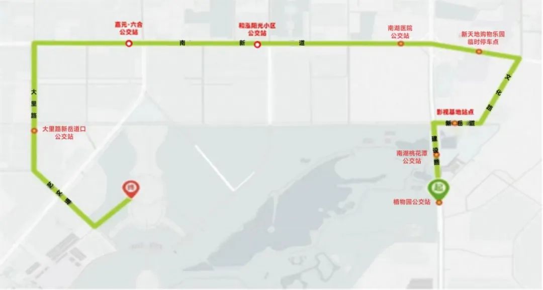 植物園公交站(南湖美食廣場(chǎng)停車場(chǎng))→南湖桃花潭公交站(影視基地停車場(chǎng))→影視基地站(影視基地停車場(chǎng)、美術(shù)館停車場(chǎng))→新天地購物樂園臨時(shí)停車點(diǎn)→南湖醫(yī)院公交站(新天地購物樂園、美泰家世界)→和泓陽光小區(qū)公交站→嘉元·六合公交站→大里路新岳道口公交站(九中地下停車場(chǎng)、兩岸一家親廣場(chǎng)停車場(chǎng))→演出場(chǎng)館(世園廣場(chǎng)臨時(shí)停車場(chǎng)指定地點(diǎn))。