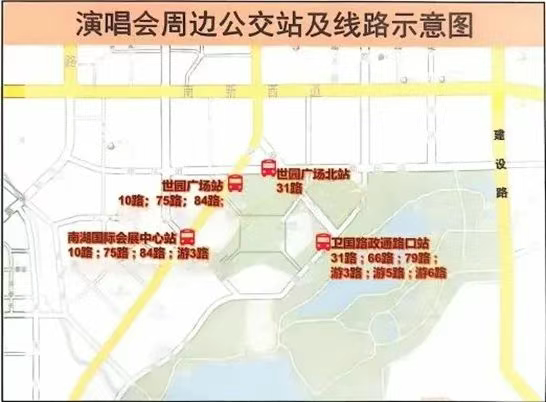 ③世園廣場(chǎng):距離演出場(chǎng)館650米,停靠線路有10路、75路、84路。