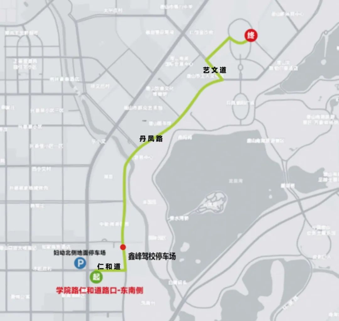 唐山站西廣場(chǎng)→竹安路→國防道→站前路→南新道→大里路→藝文道→內(nèi)部路與藝文道交口→演出場(chǎng)館(世園廣場(chǎng)臨時(shí)停車場(chǎng)指定地點(diǎn))