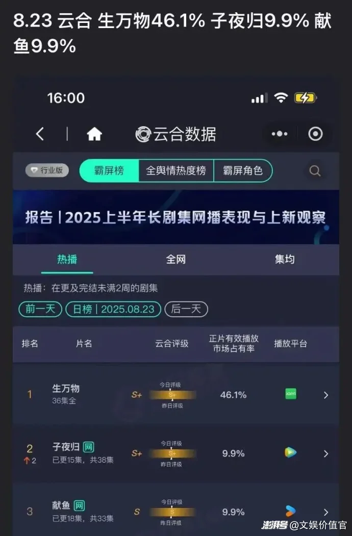 本以為暑期檔不會(huì)再出新的黑馬,結(jié)果8月下旬,劇集市場(chǎng)跑出令市場(chǎng)振奮的作品——楊冪主演的年代大劇《生萬(wàn)物》,央視收視率持續(xù)突破4%。平臺(tái)熱度也持續(xù)飆升,愛(ài)奇藝播出第十天單日播放量達(dá)到1.16億,實(shí)現(xiàn)連續(xù)四天破億,云合數(shù)據(jù)顯示最高市占率高達(dá)46.1%。