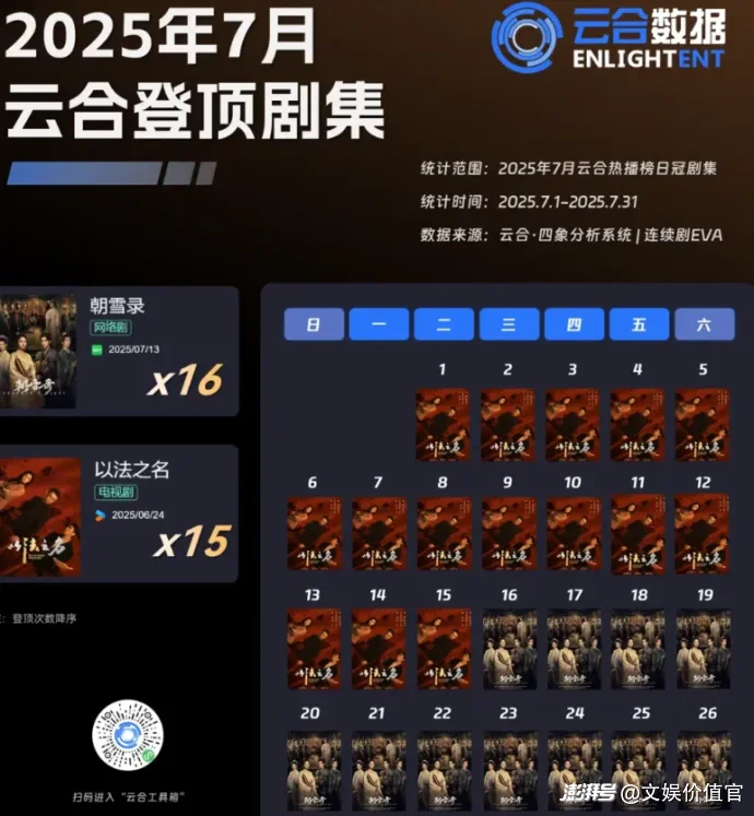 暑期檔,優(yōu)酷借《以法之名》打響了白夜劇場(chǎng)“守正系列三部曲”,2025年7月云合數(shù)據(jù)連續(xù)劇熱播榜中,2部劇集登頂榜首。其中,愛(ài)奇藝《朝雪錄》登頂16次,而優(yōu)酷的《以法之名》登頂15次。