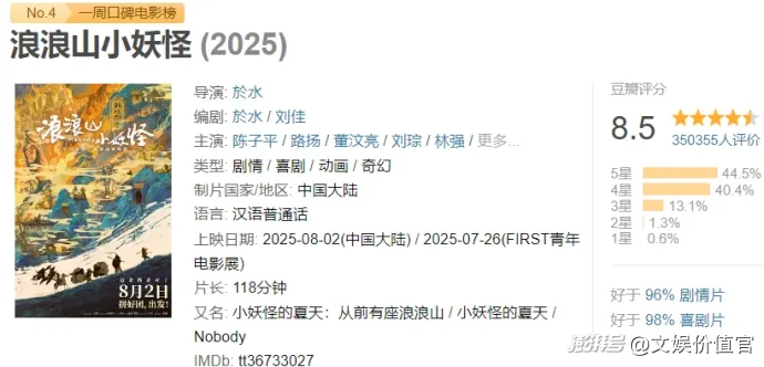 另一部黑馬是動(dòng)畫電影《浪浪山小妖怪》,上映前實(shí)在沒(méi)人能想到一部二維動(dòng)畫能成功。上映23天票房12.62億,這個(gè)數(shù)字足以讓不少高成本的三維動(dòng)畫電影反思。“小妖怪”誕生于《中國(guó)奇譚》中的一個(gè)故事,豆瓣網(wǎng)友的觀感也是很多觀眾共同的感受,“美術(shù)第一梯隊(duì),但當(dāng)年獨(dú)步天下的美影廠也難以復(fù)現(xiàn)其巔峰。表達(dá)的風(fēng)格我喜歡,中式幽默無(wú)厘頭,尤其是黃鼠狼和二狗的設(shè)計(jì),太搞笑了?!背撕眯Γ娪袄镄⊙植晃窂?qiáng)權(quán),屢敗屢戰(zhàn)的勇氣也是觀眾用腳投票的原因。