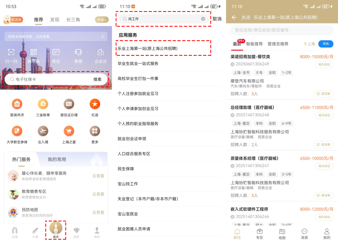 求職者可以登錄“隨申辦市民云”APP→首頁(yè)搜索框中輸入關(guān)鍵字“找工作”→點(diǎn)擊“樂(lè)業(yè)上海第一站(原上海公共招聘)”進(jìn)入服務(wù)。