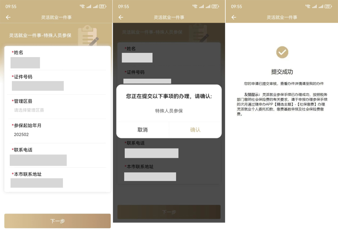 核對(duì)【姓名】【證件號(hào)碼】【就業(yè)登記日期】信息后,根據(jù)本人實(shí)際情況,選擇對(duì)應(yīng)【管理區(qū)縣】,并在【靈活就業(yè)參保】選項(xiàng)內(nèi)選擇【是】后,系統(tǒng)將自動(dòng)生成繳費(fèi)起始年月。點(diǎn)擊“下一步”→頁(yè)面提示以下信息,即表示已辦理成功。