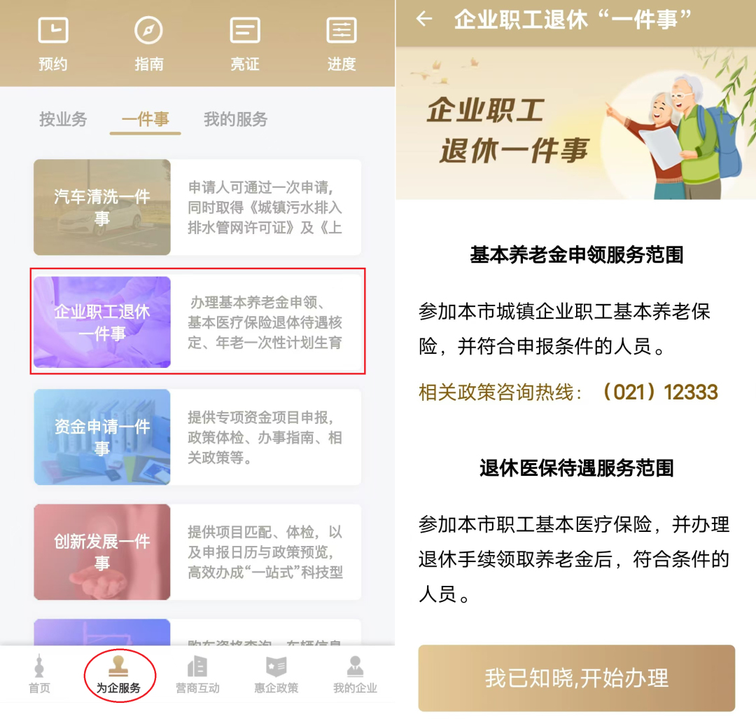 下載并登錄“隨申辦企業(yè)云”APP→點(diǎn)擊頁面下方“為企服務(wù)”欄目,進(jìn)入“一件事”專區(qū),選擇“企業(yè)職工退休一件事”→進(jìn)入“辦理須知”頁面,認(rèn)真閱讀相關(guān)內(nèi)容后,點(diǎn)擊“我已知曉,開始辦理”按鈕進(jìn)入信息填報頁面。