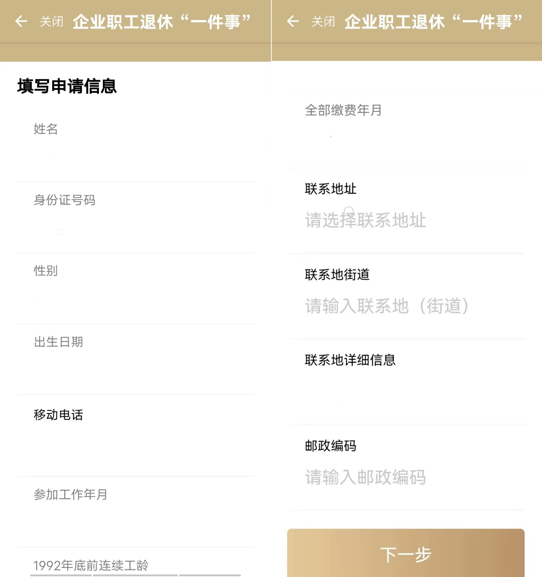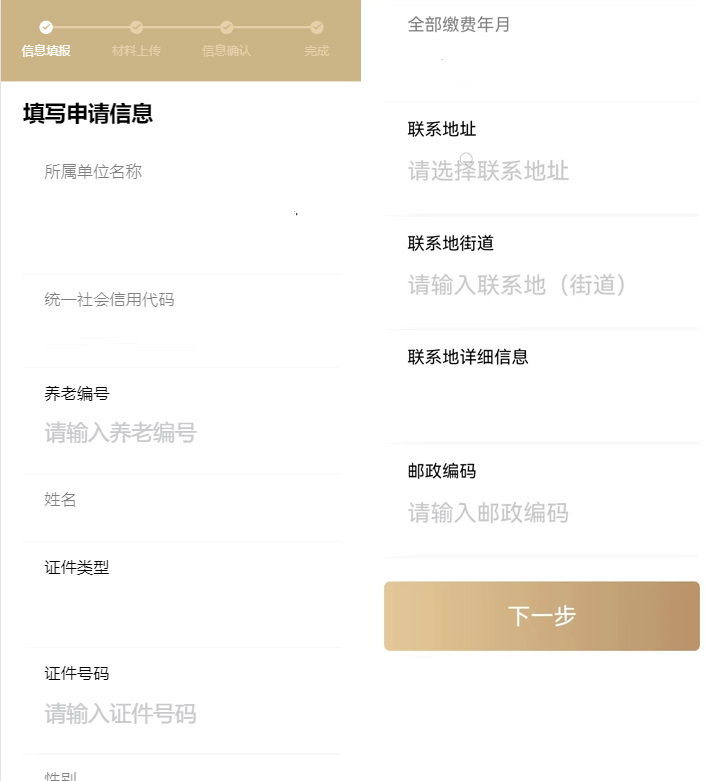 “填寫申請信息”頁面中,確認(rèn)單位信息和養(yǎng)老編號(單位當(dāng)前養(yǎng)老“最大序號+1”,單位對編號有特殊需求的,可以自行設(shè)置),錄入申領(lǐng)人的“證件類型”和“證件號碼”,即可通過信息共享獲取大部分個人信息,其中聯(lián)系信息可修改。