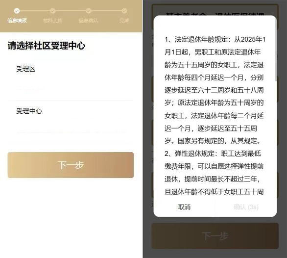 選擇辦理“年老退休一次性計劃生育獎勵費(fèi)”或“退休住院保障計劃”的,按申領(lǐng)人戶籍所在地選擇受理區(qū)及受理中心→完成相關(guān)信息填報后,點(diǎn)擊“下一步”,對于符合相關(guān)條件的申領(lǐng)人,系統(tǒng)提示“重要提醒”,閱讀后點(diǎn)擊“確認(rèn)”,繼續(xù)申報。