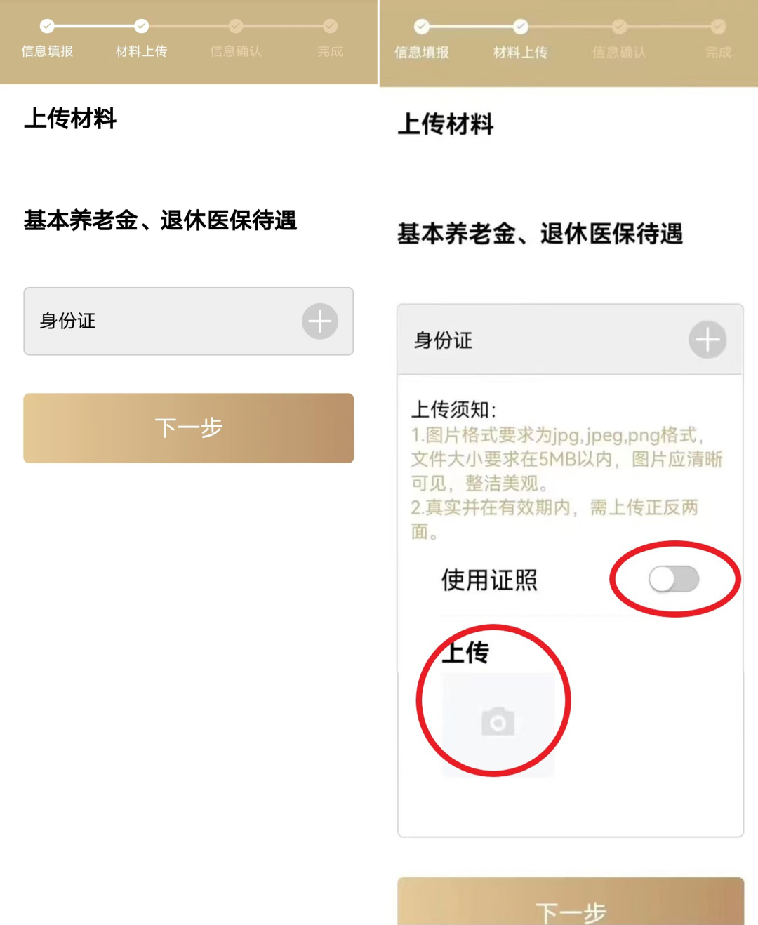 信息填報完成后,點(diǎn)擊“下一步”按鈕,進(jìn)入“材料上傳”頁面→上傳材料可選擇“使用證照”,調(diào)用電子證照庫材料,或選擇手動“上傳”。