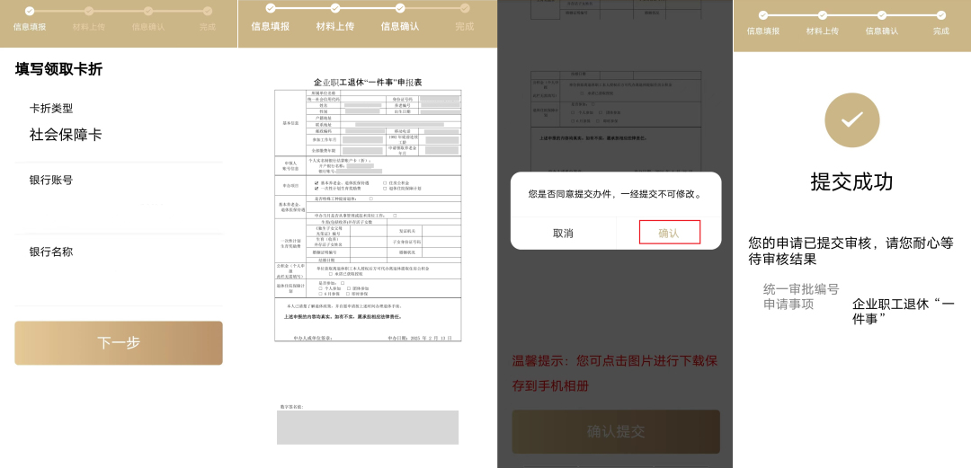 填寫申領(lǐng)人本人實名制銀行賬戶信息,默認(rèn)為第三代社會保障卡關(guān)聯(lián)的銀行賬號;若未獲取到其在本市社會保障卡信息的,可選擇其他銀行,銀行賬戶類型須為一類結(jié)算賬戶。填寫完成后,系統(tǒng)會對銀行賬號有效性進(jìn)行實時校驗→進(jìn)入“信息確認(rèn)”頁面,核對申報信息后,點(diǎn)擊“確認(rèn)”,系統(tǒng)提示“提交成功”,完成業(yè)務(wù)申報。
