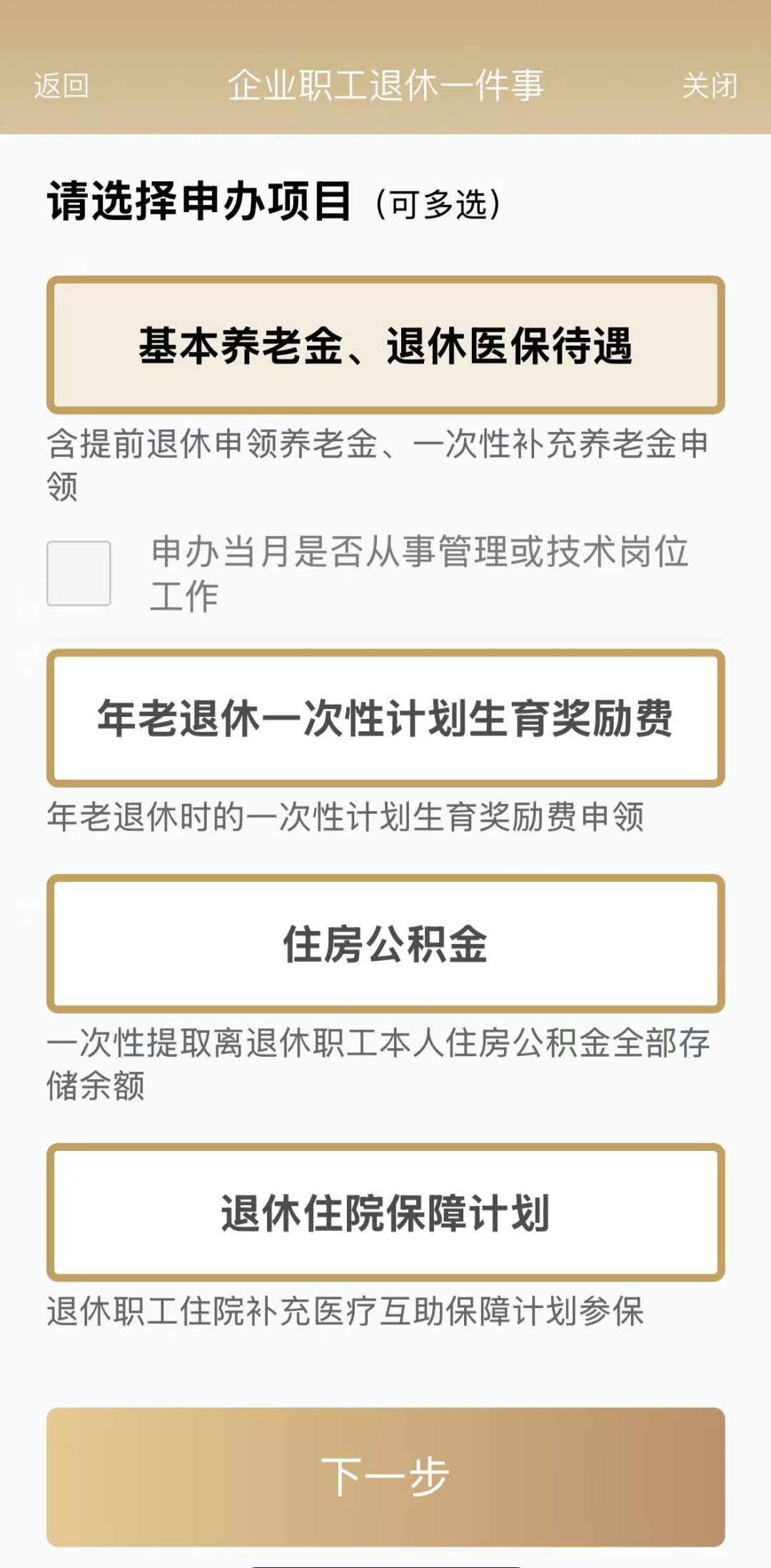 基本信息填寫無誤后,繼續(xù)選擇需要申報的項目。其中,“基本養(yǎng)老金、退休醫(yī)保待遇”默認(rèn)為必選項,“年老退休一次性計劃生育獎勵費(fèi)”“住房公積金”“退休住院保障計劃”可根據(jù)需求進(jìn)行申報。