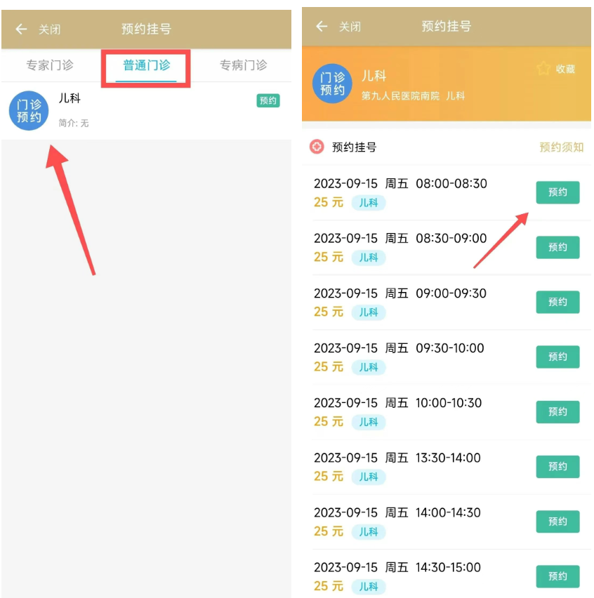 第三步:可選擇專家門診、普通門診、專病門診,這里我們以選擇普通門診為例,選擇合適的時間段點擊“預(yù)約”。