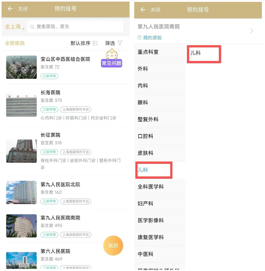 第二步:搜索想去的醫(yī)院,也可按條件進行篩選(按距離、醫(yī)院等級篩選),隨后點擊進入科室頁面選擇目標科室。
