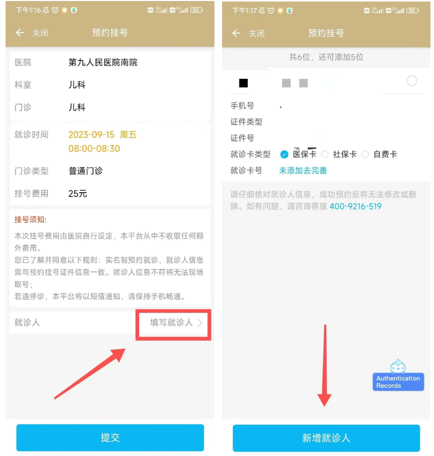 第四步:如您此前未添加就診人信息,請點擊“填寫就診人”進入就診人頁面,點擊新增就診人,按提示填寫信息。
