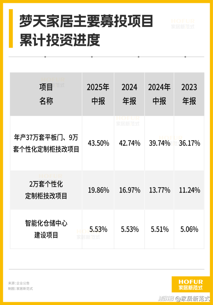 家居新范式梳理發(fā)現(xiàn),這些募投項(xiàng)目處于“低投資”狀態(tài),甚至有的項(xiàng)目“按兵不動(dòng)”。2024年末,上述募投項(xiàng)目累計(jì)投資進(jìn)度分別42.74%、16.97%和5.53%;2025年6月末,相關(guān)項(xiàng)目累計(jì)投資進(jìn)度分別為43.50%、19.86%和5.53%。