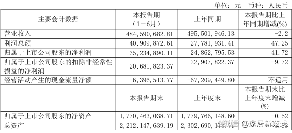 夢天家居2025年半年報(bào)顯示,公司實(shí)現(xiàn)營收為4.85億元,同比下降2.20%;實(shí)現(xiàn)歸屬凈利潤為3523萬元,同比增長41.72%;扣非凈利潤為2068萬元,同比下降9.72%。