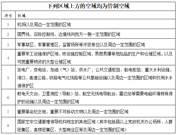 管制空域:真高120米以上空域,空中禁區(qū)、空中限制區(qū)以及周邊空域,軍用航空超低空飛行空域,以及下列區(qū)域上方的空域。