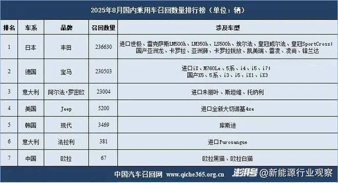 圖/2025年8月國(guó)內(nèi)乘用車召回?cái)?shù)量排行榜