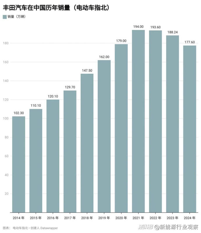 可惜好景不長(zhǎng),隨著新能源汽車逐漸崛起,豐田進(jìn)入了連續(xù)下跌的困境期,2023年、2024年在華累計(jì)銷量分別跌至188萬(wàn)輛、178萬(wàn)輛。