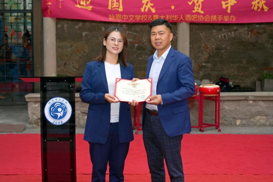 左起:意大利詠恩中文學(xué)校副校長(zhǎng)潘曉靜,米蘭浙江僑商聯(lián)合會(huì)會(huì)長(zhǎng)林茂風(fēng)