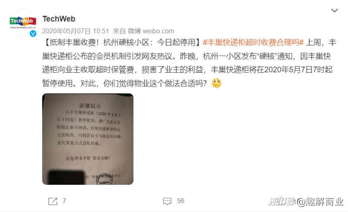 據(jù)媒體報道,2020年豐巢宣布針對存放超12小時包裹進行收費時,就曾引發(fā)網(wǎng)友熱議。杭州某小區(qū)甚至發(fā)布《關于豐巢快遞柜暫停使用的通知》,通知決定暫停啟用豐巢快遞柜。然而時至今日,社交平臺上仍能看到網(wǎng)友關于豐巢滯留費的吐槽。