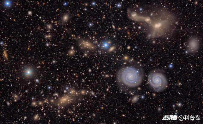 這張圖片展示了魯賓天文臺拍攝的室女座星系團完整視場中的另一小塊區(qū)域。圖中可以看到:兩個顯著的旋渦星系(位于右下角)、三個正在合并的星系(位于右上角)、幾群遙遠的星系,以及我們銀河系中的許多恒星等許多有趣的天體。(來源:魯賓天文臺官網)