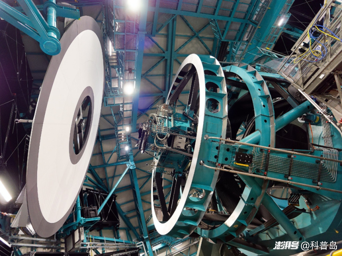 魯賓天文臺的西蒙尼巡天望遠鏡正在為穹頂內的校準工作做準備??茖W家們利用左側的白色屏幕和一個均勻光源,來測量LSST相機32億像素之間的響應差異。這些差異源于探測器制造過程中的固有偏差,而非我們從太空中收集到的光線本身的變化??茖W家們將利用通過這塊屏幕收集到的校準信息,來分辨這些制造偏差在最終科學數(shù)據(jù)中造成的影響。(來源:魯賓天文臺官網)