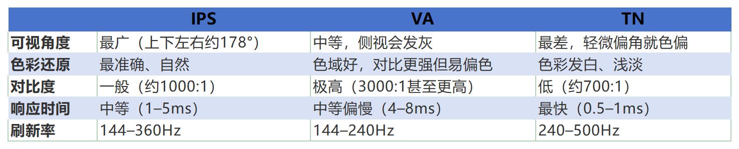 在初步了解三種顯示器的區(qū)別后,再來深入說說IPS、VA和TN,其中TN屏最近兩年已經(jīng)非常少見,常見的顯示器主要以IPS和VA為主,三類面板之間的區(qū)別并不小,為了方便大家快速了解,小雷制作了一個表格: