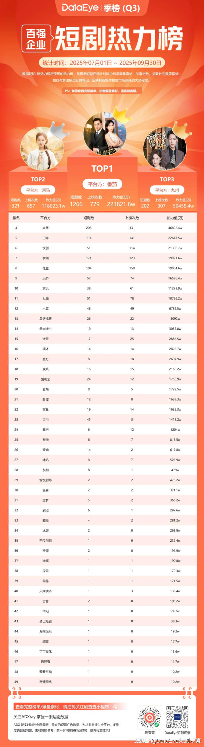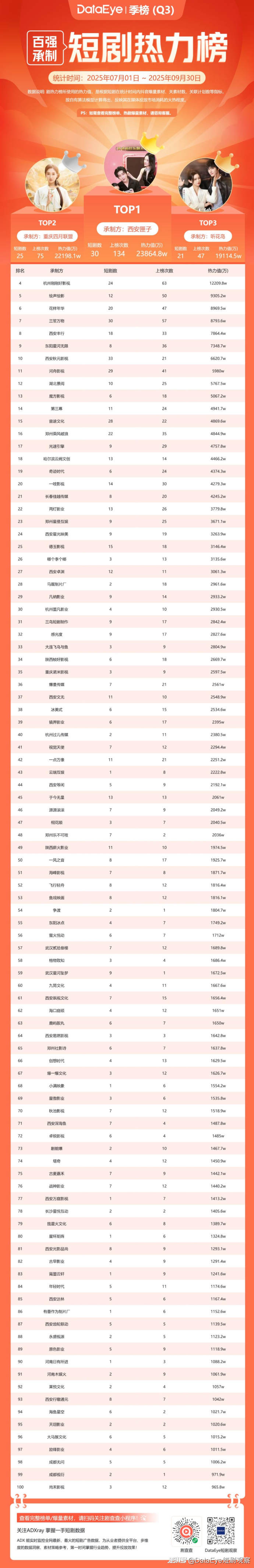 本期,DataEye短劇觀察發(fā)布2025年Q3微短劇行業(yè)百強榜,分別為Q3百強熱劇、Q3百強平臺方、Q3百強承制方。